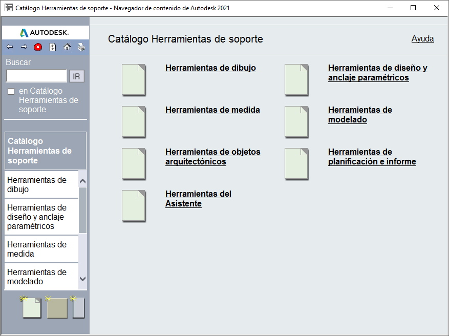 Para ver un catálogo de herramientas, pulse el catálogo en la biblioteca de catálogos. Por ejemplo pulse en el catálogo de herramientas de soporte para ver una ventana como la de la ilustración siguiente: