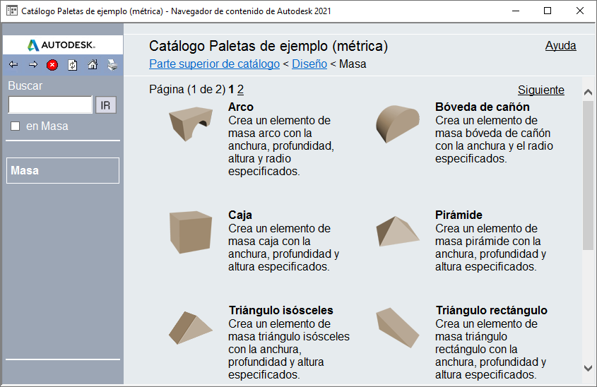 Una categoría de catálogo de herramientas puede contener más elementos de los que caben en una página. Si son necesarias varias páginas, aparecen unos controles de navegación en la parte superior e inferior de cada página. El contenido de la categoría de herramientas Elemento de masa mostrada anteriormente ocupa dos páginas. Puede especificar la página que debe mostrarse pulsando el número de página o en Siguiente o Ant. (Tenga en cuenta que estos controles también aparecen en la parte inferior de la página.) También puede cambiar el número de elementos que aparecen en las páginas del Navegador de contenido.