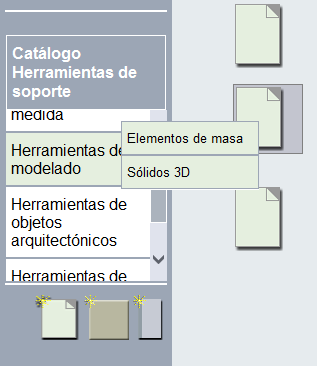 Las categorías pueden subdividirse en uno o más niveles. Si hay subcategorías, aparece una lista al colocar el puntero sobre una categoría en el panel izquierdo. Por ejemplo, en el catálogo de herramientas de soporte, sitúe el puntero sobre las herramientas de modelado para ver las subcategorías Elemento de masa y Sólidos 3D.