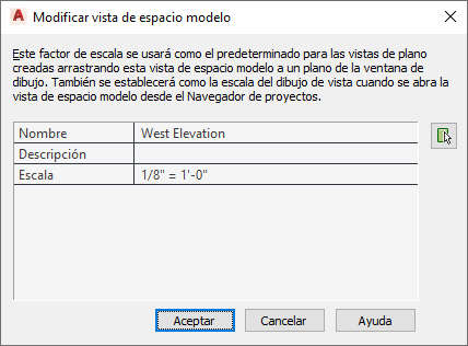 Nota: Para cambiar el nombre, la descripción o la escala de una vista de espacio modelo, no es necesario que el dibujo de vista asociado esté abierto. Para cambiar los contornos de espacio modelo, el dibujo de vista asociado debe estar abierto.