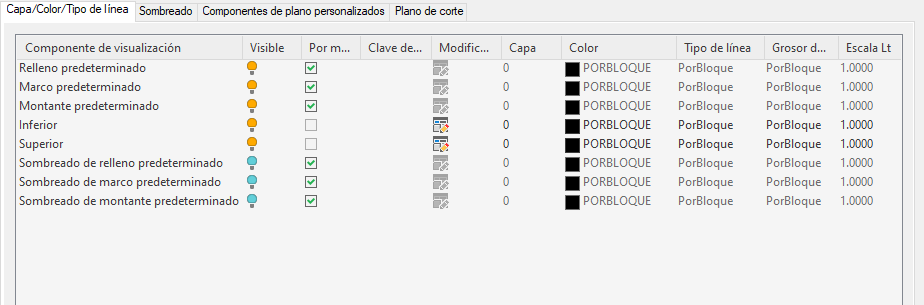 | a una altura inferior al valor de Altura del plano de corte | los objetos se muestran con las propiedades especificadas para el componente Por debajo de plano de corte en la ficha Capa/Color/Tipo de línea. |