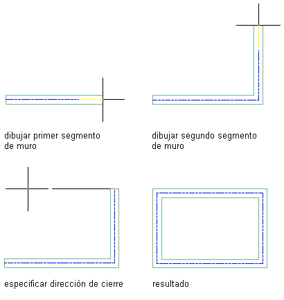 Esta opción cierra el muro creando un segmento de muro desde el último punto especificado para los muros hasta el primer punto especificado en este grupo de muros. Escriba c (Cerrar) en la línea de comando para utilizar esta opción al colocar muros.