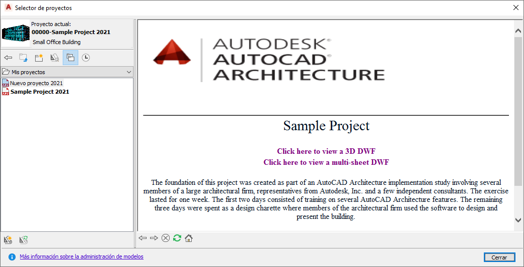 En el Selector de proyectos se crean proyectos nuevos, se configuran los parámetros y las normas del proyecto, se agrega información detallada y se selecciona el proyecto actual. Si define un proyecto como activo desde el menú contextual o haciendo doble clic en el nombre de archivo, el proyecto se migra a un formato compatible con la versión actual del Conjunto de herramientas AutoCAD Architecture 2027. Si además cambia la ruta del proyecto, también se migrarán todos los dibujos del proyecto, y no podrá abrir el proyecto en ninguna versión anterior del software.