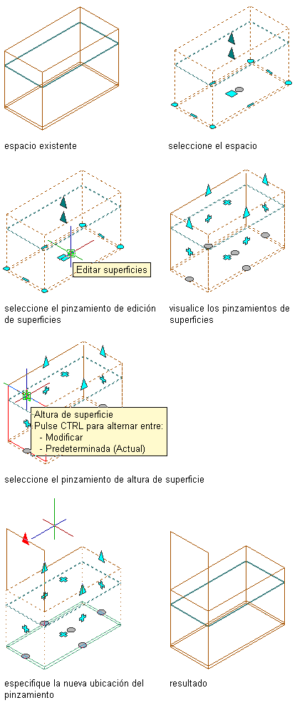Consejo: Si mueve el pinzamiento de altura de una superficie, pero no puede ver la superficie resultante, es posible que se haya desactivado el componente de visualización Superficies en el estilo de espacio o en las propiedades de visualización de objetos.