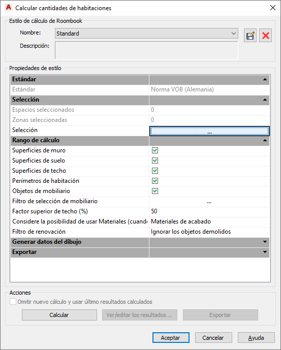 - Si se añaden nuevos espacios o zonas a un dibujo después de haber realizado un cálculo de cantidad de habitaciones, esta opción especifica que los nuevos espacios y zonas se incluyan automáticamente en el próximo cálculo. Por defecto, la opción está activada.