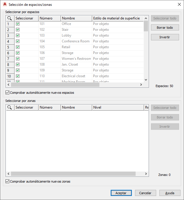 - En este cuadro de diálogo, solo se pueden seleccionar los espacios y las zonas para calcular activando la marca de verificación.