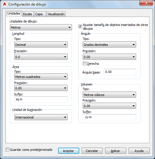 | guardar los parámetros de unidades como parámetros predeterminados para dibujos nuevos que se realizan partiendo de cero o a partir de plantillas que no contienen información de configuración de dibujo | seleccione Guardar como predeterminado. Los parámetros de las fichas Escala y Capa también se guardan como parámetros predeterminados. |