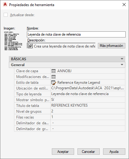 En cuanto a las herramientas para insertar notas clave de referencia, en la hoja de trabajo Propiedades de herramientas el campo Notas clave AEC se especifica como la propiedad Texto predeterminado. En el caso de una herramienta para la inserción de notas clave de plano, este campo se especifica como una definición de atributo en el bloque identificado por las propiedades Símbolo y Ubicación de símbolo. En cualquier caso, un campo Notas clave AEC se puede insertar o editar en el cuadro de diálogo Campo.