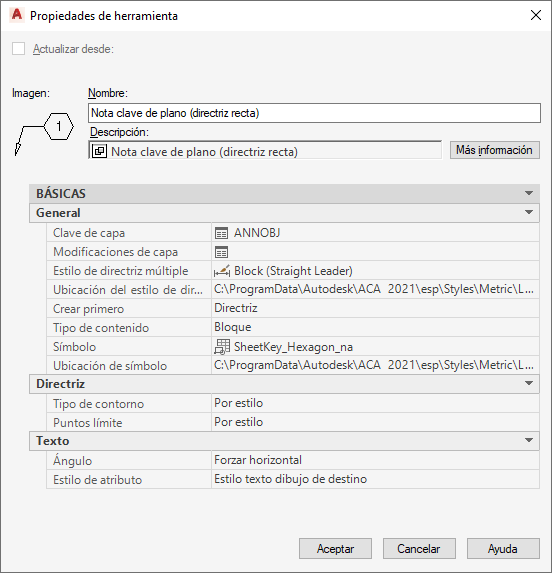 se pueden copiar en cualquier paleta de herramientas. Estas herramientas para insertar notas clave están basadas en la herramienta de anotación básica. Se pueden personalizar mediante la hoja de trabajo Propiedades de herramientas a la que se accede desde el menú contextual.