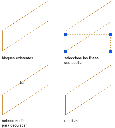 Utilice este procedimiento para enmascarar u ocultar una región de la línea en relación con otra línea. Esta función resulta especialmente útil para indicar que una entidad se alarga por detrás o por debajo de otra entidad que desea mostrar en primer plano. La línea enmascarada se coloca en la capa especificada por la clave de capa OCULTA. Cuando haya iniciado el comando Enmascarar, también puede especificar para su uso dos esquinas de un rectángulo.