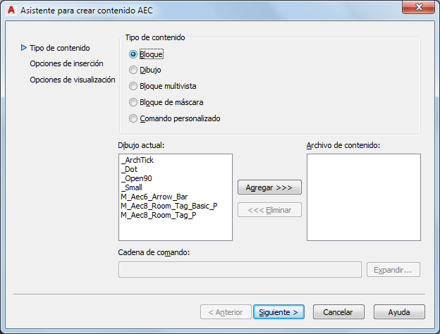 El Asistente para crear contenido AEC le ayuda a crear contenido personalizado. Permite crear bloques, dibujos y comandos a partir de datos existentes en el dibujo actual.