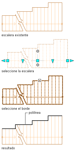 Utilice este procedimiento para generar una polilínea desde el borde de una escalera. La polilínea se genera en el alzado inferior de la escalera.