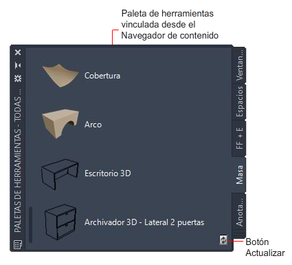 Cuando se vincula una paleta de herramientas al conjunto de paletas de herramientas desde un catálogo del Navegador de contenido, la paleta tendrá el botón Actualizar en la parte inferior.