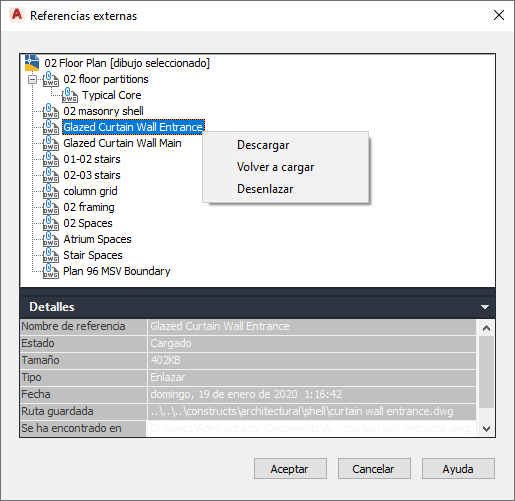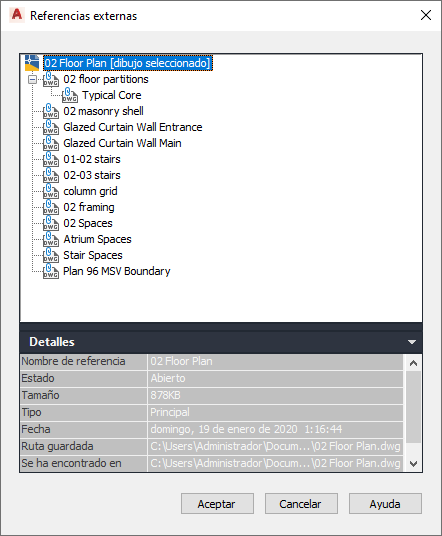 7. En el cuadro de diálogo Referencias externas, visualice los detalles de la referencia externa: