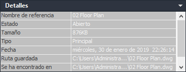 • El estado muestra si la referencia externa está cargada o descargada en el dibujo principal, y muestra el dibujo principal como abierto si está abierto en la ventana de dibujo. Si el dibujo principal no está abierto en la ventana de dibujo, el estado está vacío.