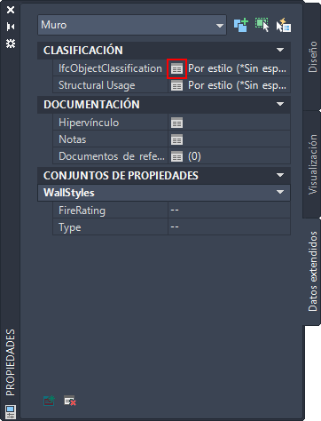 - En la paleta Propiedades, en la ficha Datos extendidos, en el grupo Clasificación, haga clic en IfcObjectClassification y seleccione la clasificación.