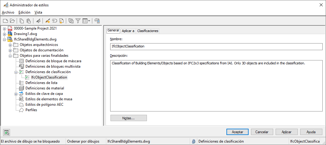 Si se exporta este dibujo en el formato de archivo IFC también se exportan las definiciones de clasificación. La definición de clasificación se enlaza al tipo de objeto al importar el dibujo.