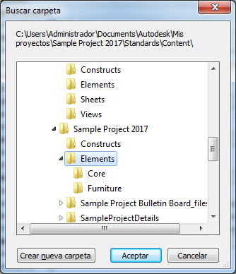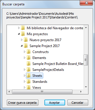 Si desea indicar una ubicación alternativa para las categorías de nivel superior (Componentes fijos, Elementos, Vistas y Planos), lo más recomendable es iniciar un proyecto nuevo. Organice primero la estructura del proyecto en el Explorador de archivos; las categorías deben figurar en la misma carpeta raíz que el archivo APJ. Por ejemplo, el proyecto se puede estructurar con componentes fijos, elementos, vistas y planos en una categoría denominada Dibujos.