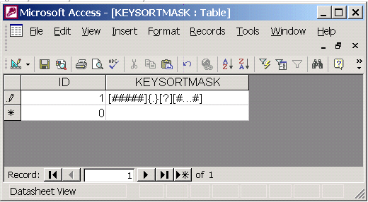 Esta tabla contiene máscaras de ordenación de claves que representan los diferentes patrones de clave usados en la base de datos. El orden en que aparecen las máscaras en esta tabla determina el orden en que se muestran los patrones de clave en el Editor de notas clave, el cuadro de diálogo Seleccionar nota clave y las leyendas de notas clave; es decir, todas las notas clave cuyas claves sigan el patrón definido por la máscara del registro 1 aparecerán antes que las notas clave cuyos patrones de clave estén identificados en los siguientes registros de la tabla. En la ilustración anterior, se muestra la máscara de ordenación de claves de la base de datos AecKeynotes incluida con Conjunto de herramientas AutoCAD Architecture 2027. En las máscaras de ordenación de claves se usan las siguientes convenciones: