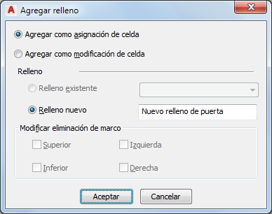 | Agregar como modificación de celda y desea insertar una puerta, ventana o un conjunto de puerta y ventana de un estilo distinto del que contiene el dibujo sin quitar el borde del marco del objeto | seleccione Relleno nuevo, especifique un nombre para el objeto y elija Aceptar. |