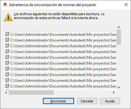 Al sincronizar un proyecto entero, se excluyen del proceso los archivos que tengan abiertos otros usuarios o sean de sólo lectura. Antes de iniciarse la sincronización del proyecto, el programa realiza una comprobación interna para averiguar si hay dibujos que no puedan sincronizarse en esta ocasión. De encontrarse alguno, se muestra una advertencia de sincronización.