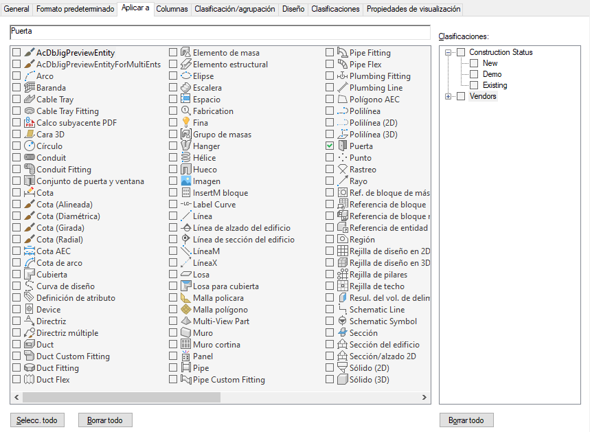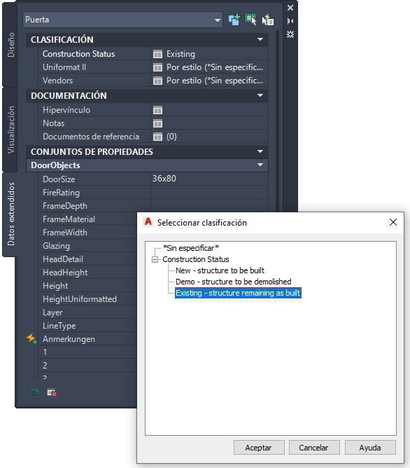 La definición de clasificación se enumera en la ficha Clasificaciones de las propiedades del estilo de objeto. En el estilo de objeto se selecciona una clasificación, como Nuevo. Por ejemplo, el dibujo puede contener determinados estilos de puerta para las puertas existentes y diferentes estilos para nueva construcción. Todas las puertas creadas a partir de estos estilos tienen la clasificación especificada en su estilo.
