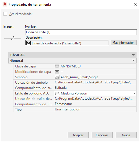 - Se recomienda que las herramientas de línea de interrupción tengan elementos de soporte almacenados en el mismo dibujo que el símbolo de línea de interrupción. Al igual que ocurre con otras herramientas de varios componentes, como las etiquetas de planificación, de este modo resulta más fácil modificarlas en el futuro. Todas las propiedades de las marcas de interrupción se definen en las propiedades de herramientas, incluso se determina si la marca de interrupción enmascara o recorta los objetos.