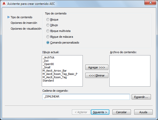 - Si va a crear herramientas para las cotas de AutoCAD normalizadas, utilice el Asistente para crear contenido AEC. De ese modo, podrá utilizar la opción Comando personalizado y las claves de capa para asegurarse de que las cotas vayan en la capa correcta.