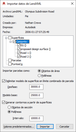 Nota: Los archivos LandXML contienen información sobre las unidades de dibujo con que se miden. Al importar un archivo LandXML a un dibujo con unidades distintas, los datos LandXML se convierten a las unidades del DWG actual. Al importar un archivo LandXML basado en la unidad metro a un dibujo basado en milímetros, las coordenadas resultantes quizá superen el rango en el que pueden realizarse cálculos exactos.