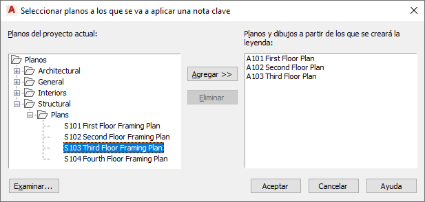 | incluir todas las notas clave de otros planos | pulse el botón derecho y seleccione Planos para que aparezca el cuadro de diálogo Seleccionar planos a los que se va a aplicar una nota clave. En el panel de la izquierda figuran los planos del proyecto actual. Seleccione los planos que necesite y colóquelos en el panel de la derecha mediante el botón Agregar. También puede pulsar el botón Examinar para buscar y recuperar planos de otros proyectos o dibujos que no se hayan guardado como planos. Cuando en el panel derecho aparezcan todos los planos o dibujos desde los que desee incluir notas clave, pulse Aceptar. |