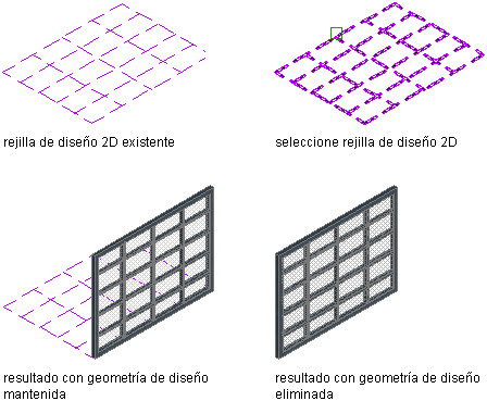 Utilice este procedimiento para crear un conjunto de puerta y ventana basado en una rejilla de diseño 2D. Si en el dibujo ya dispone de rejillas de diseño 2D, puede convertirlas fácilmente en conjuntos de puerta y ventana. O bien, si está habituado al uso de rejillas de diseño, encontrará que son una forma eficaz de crear conjuntos de puerta y ventana que puede usar para probar con los comandos para conjuntos de puerta y ventana y aprender más sobre éstos.