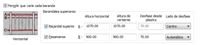 | especificar las propiedades de barandales superiores y pasamanos, como altura horizontal, altura con inclinación y distancia de desfase, al agregar o modificar barandas | seleccione Permitir que varíe cada baranda. |