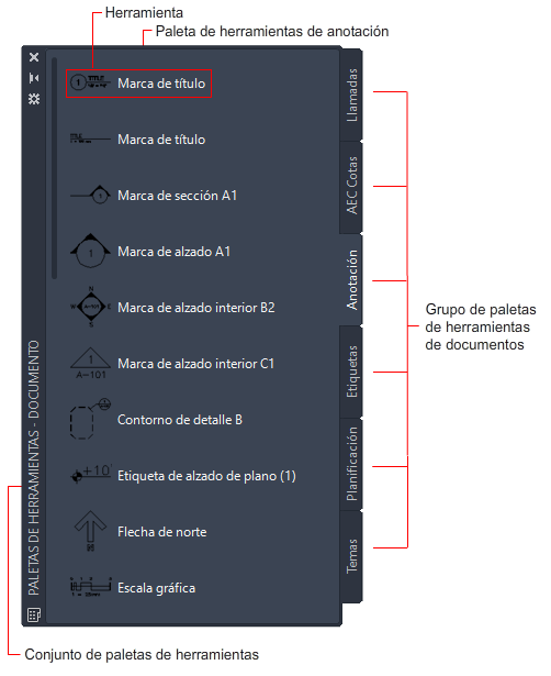 Aunque puede definir distintas paletas de herramientas para diferentes perfiles de usuario, durante una sesión de Conjunto de herramientas AutoCAD Architecture 2027 solo puede estar activo un conjunto de paletas de herramientas. Cuando se usan distintos perfiles de usuario, las paletas de herramientas obtenidas se combinan en un conjunto de paletas de herramientas.