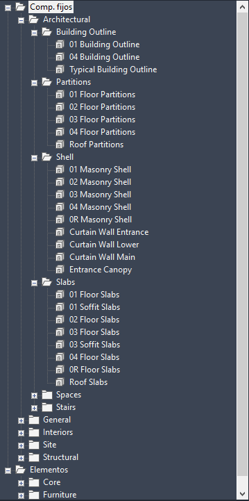 Explorador de dibujos con la ficha Componentes fijos completamente expandida