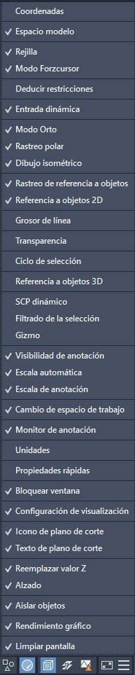 Se pueden mostrar u ocultar cada uno de los comandos del menú de la barra de estado.