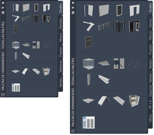 La visualización de las paletas de herramientas depende de los parámetros definidos para todo el conjunto de paletas de herramientas y los parámetros definidos para las paletas de herramientas individuales. En el conjunto de paletas de herramientas, especifique las opciones de ocultar automáticamente, transparencia, tamaño, y posición.