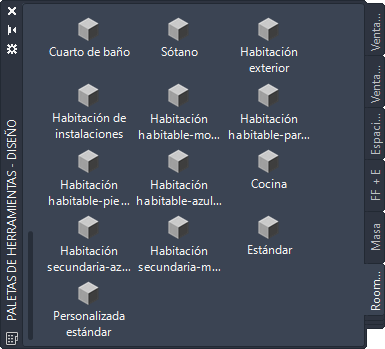 La paleta de herramientas Roombook contiene los diferentes estilos de material de superficie. Los comandos están vinculados al archivo Roombook Styles.dwg.