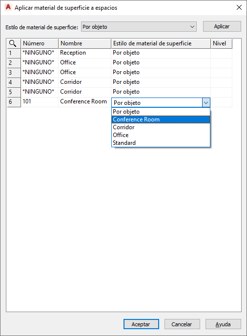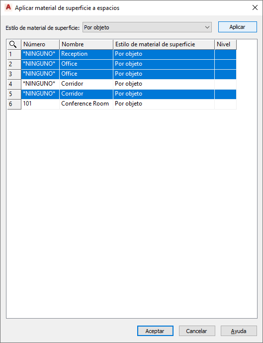 2. En el cuadro de diálogo Aplicar material de superficie a espacios, aplique el estilo de material de superficie y haga clic en Aplicar.
