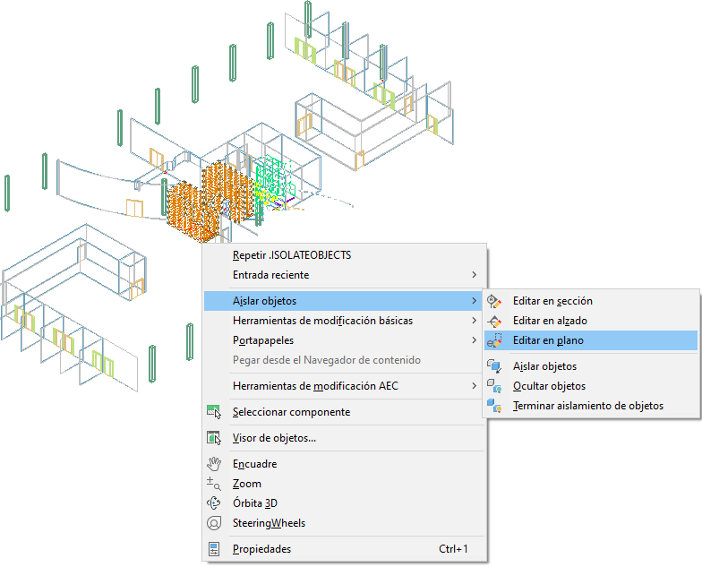 Puede especificar una selección de objetos en un dibujo y visualizarlos y editarlos en una vista en planta, de alzado o de sección temporal. El SCP se alinea con la vista temporal mientras se edita.