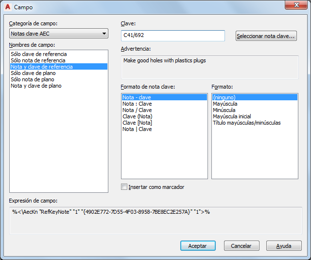 | insertar un campo de nota clave en un elemento de texto | consulte Para insertar campos en texto de AutoCAD. |