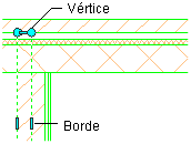 Cuando se edita una intersección de muro in situ, para cada componente se crea un perfil temporal en los segmentos de muro que intersecan. Los perfiles del componente con el número de índice inferior del estilo de muro se muestran en primer lugar. Cuando se selecciona un perfil, aparecen los pinzamientos de vértice y borde para editar su geometría. Puede pulsar Esc para desmarcar los componentes seleccionados.