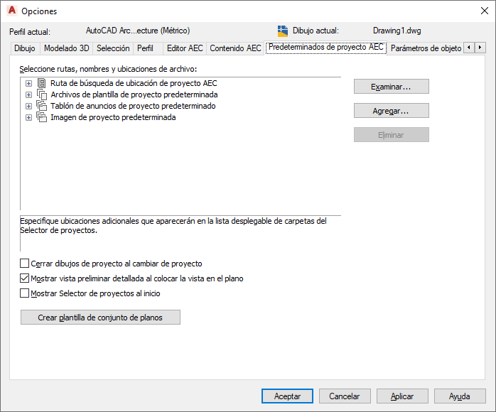 Especificación de las opciones predeterminadas de Predeterminados de proyecto AEC para el dibujo actual