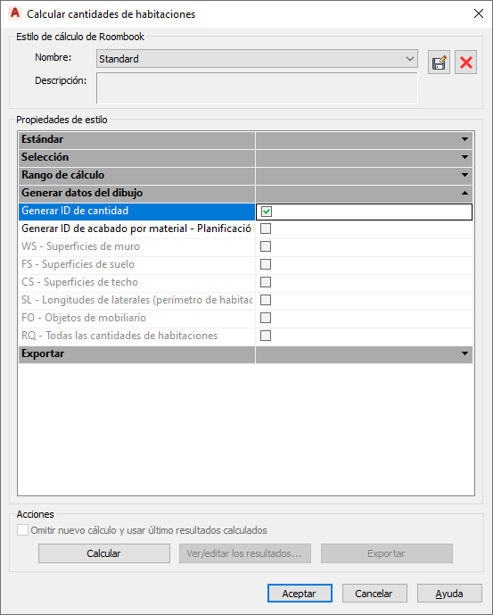 En el cuadro de diálogo Cálculo de cantidades de habitaciones, en Propiedades de estilo, lista Generar datos del dibujo, seleccione Generar ID de cantidad.