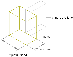 Todas las rejillas de conjunto de puerta y ventana, incluida la rejilla principal, pueden tener definiciones de marco. El marco de un conjunto de puerta y ventana está representado por los bordes exteriores de la rejilla. El tamaño total del marco está determinado por la longitud y la altura de la rejilla del conjunto de puerta y ventana. Puede definir un marco especificando su anchura y profundidad o bien mediante la selección de un perfil.