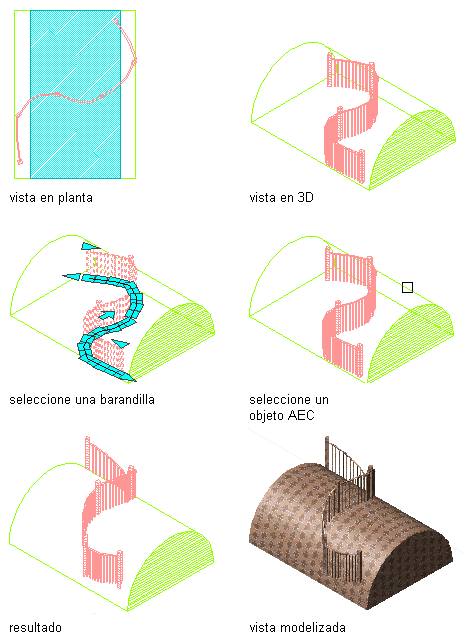 Utilice este procedimiento para anclar una baranda existente a un objeto AEC que no sea una escalera. Una vez anclada, la baranda permanece donde está en el dibujo, pero se mueve cuando la escalera a la que está enlazada se mueve a su vez. lo que permite crear rutas con forma libre en la baranda de una escalera u otro objeto.