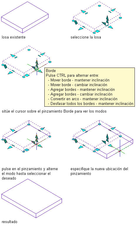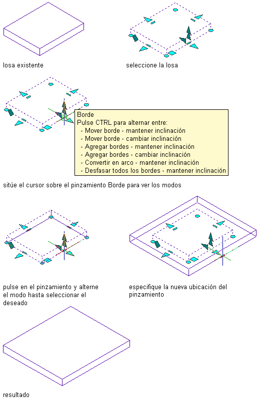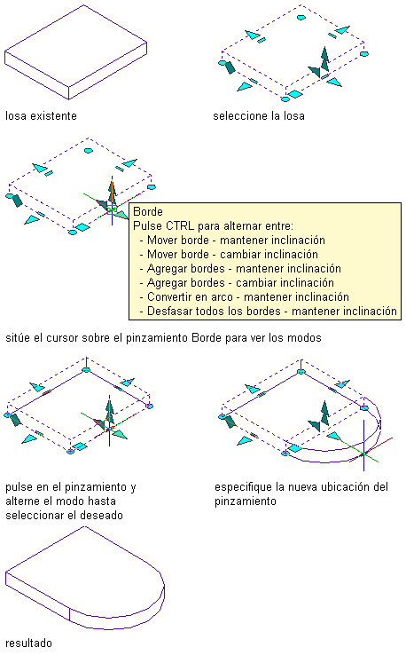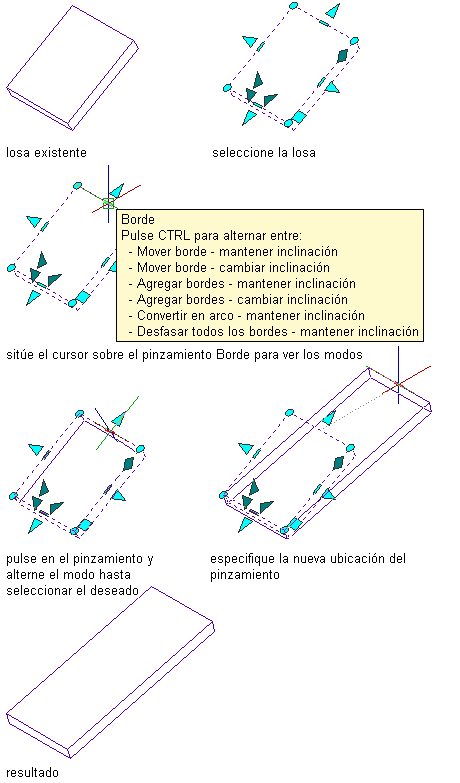 Mediante el procedimiento general siguiente, seleccione un modo de pinzamiento de borde y modifique el borde de una losa o losa para cubierta: