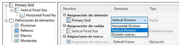 Las divisiones definen la orientación (si la dirección de las celdas y montantes de la rejilla es horizontal o vertical) y el tipo de división (número y tamaño de las celdas) de la rejilla.