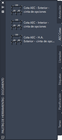 Las paletas personalizadas creadas por el administrador de CAD o por otros usuarios también pueden contener herramientas de acotación AEC con estilos y propiedades de cota AEC establecidos según las normas de una empresa o proyecto.