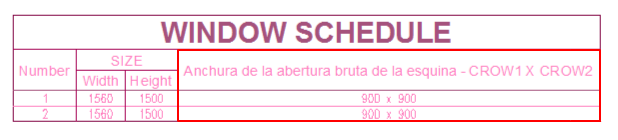 17. Observe que, en la tabla de planificación generada, aparece la propiedad automática Anchura de la abertura bruta de la esquina - CROW1 X CROW2.