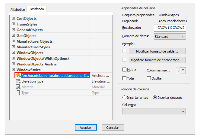 8. En el cuadro de diálogo Agregar columna, en Estilos de ventana, seleccione Anchura de la abertura bruta de la esquina - CROW1 X CROW2.